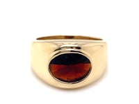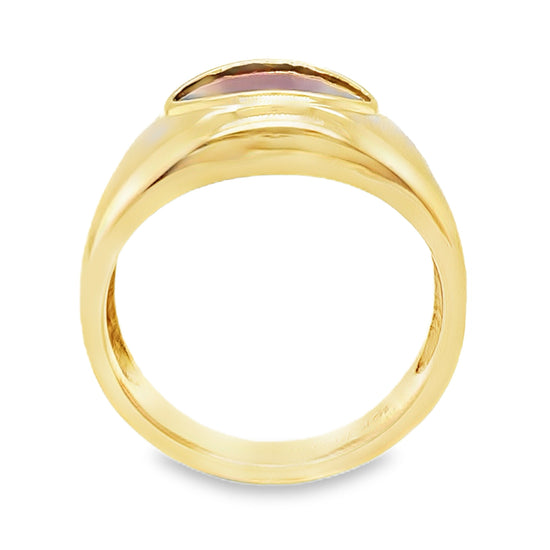 10K yellow gold faceted garnet ring. 5.2 grams. 12mm wide tapering down to 4mm, ring size 5.75.