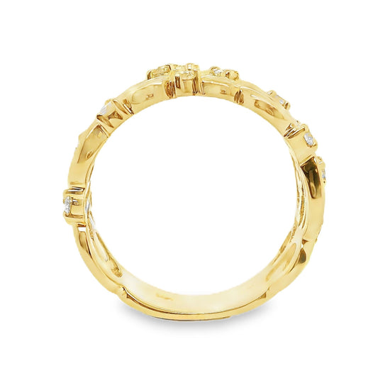 14K yellow gold diamond ring. 7.6 grams. 14 round brilliant cut diamonds, .25 total carat weight, SI clarity, GHI color. 12mm wide, slightly tapered, ring size 7.75.