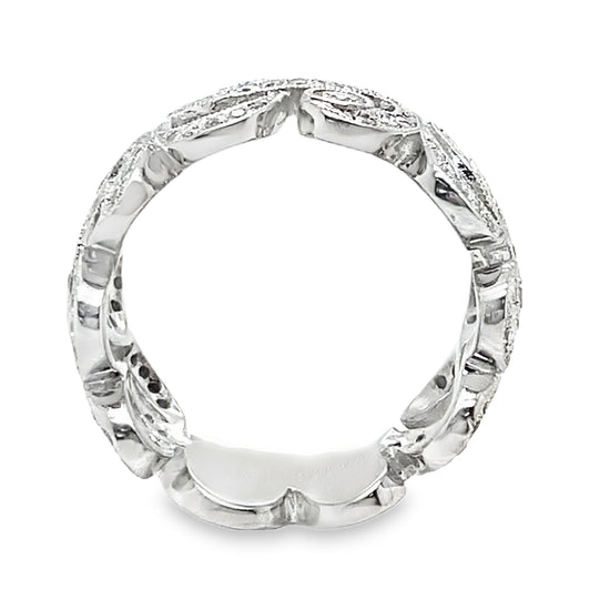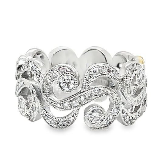 800-1793918K white gold wide diamond wave ring. 8.5 grams. Round brilliant cut diamonds, 1.00 total carat weight, SI1-I1 clarity, GH color. 10mm in width. Ring size 6.5.